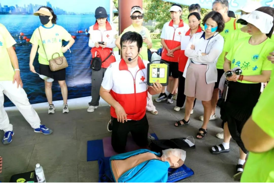 7月13日下午,武昌大堤口长江边人头攒动,一场别开生面的水上救生知识和救援技能普及活动在此举行。在洪山区红十字“救在身边”志愿服务队老师的指导下,两百余名游泳爱好者学习防溺水知识、练习心肺复苏、实操应急救人,为即将到来的7.16武汉渡江节做好准备。