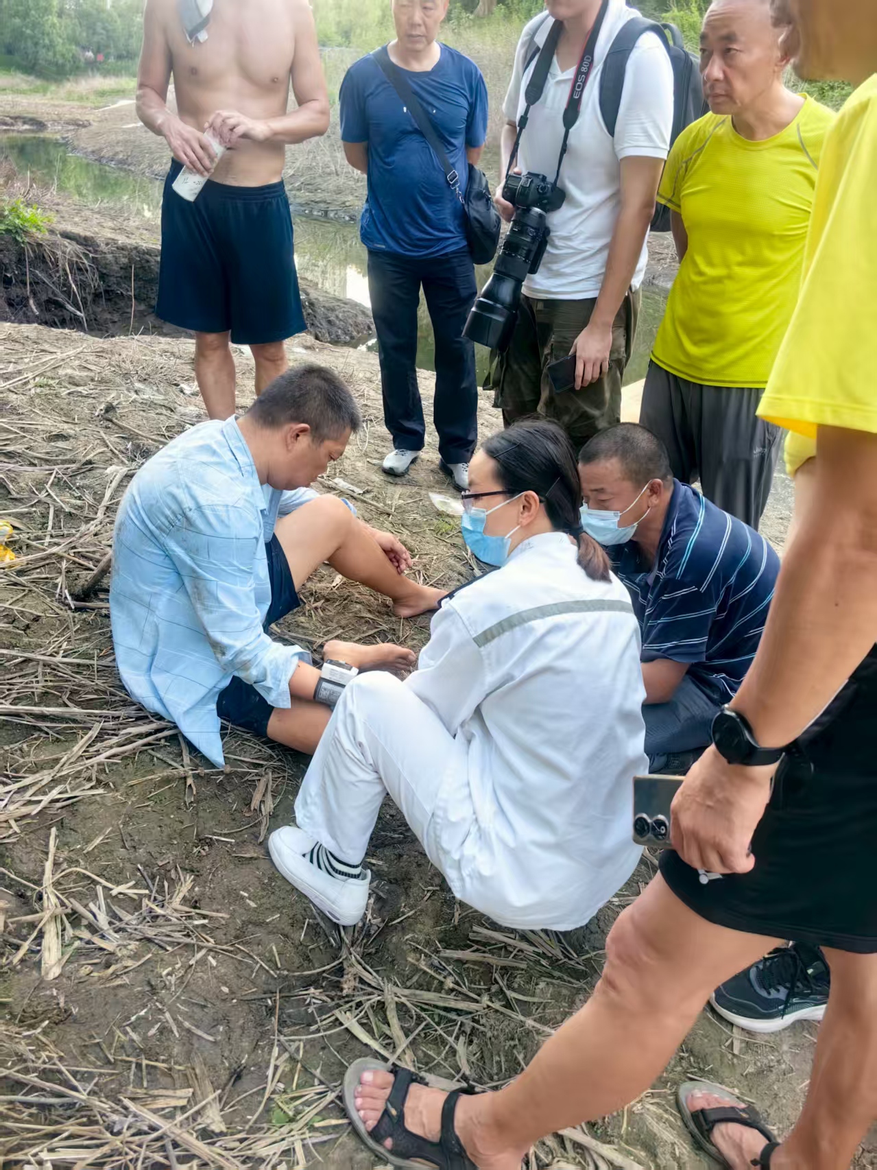 “时间就是生命!” 队员们立即实施应急救援,一边对患者进行初步检查与紧急处置,一边拨打120急救电话,精准通报事发位置和患者症状。等待救护车到来期间,队员半跪在潮湿的泥地上,密切观察生命体征变化,一手托稳患者颈部保持呼吸通畅,一手轻拍其肩膀轻声安抚,防范因焦虑引发的病情恶化。