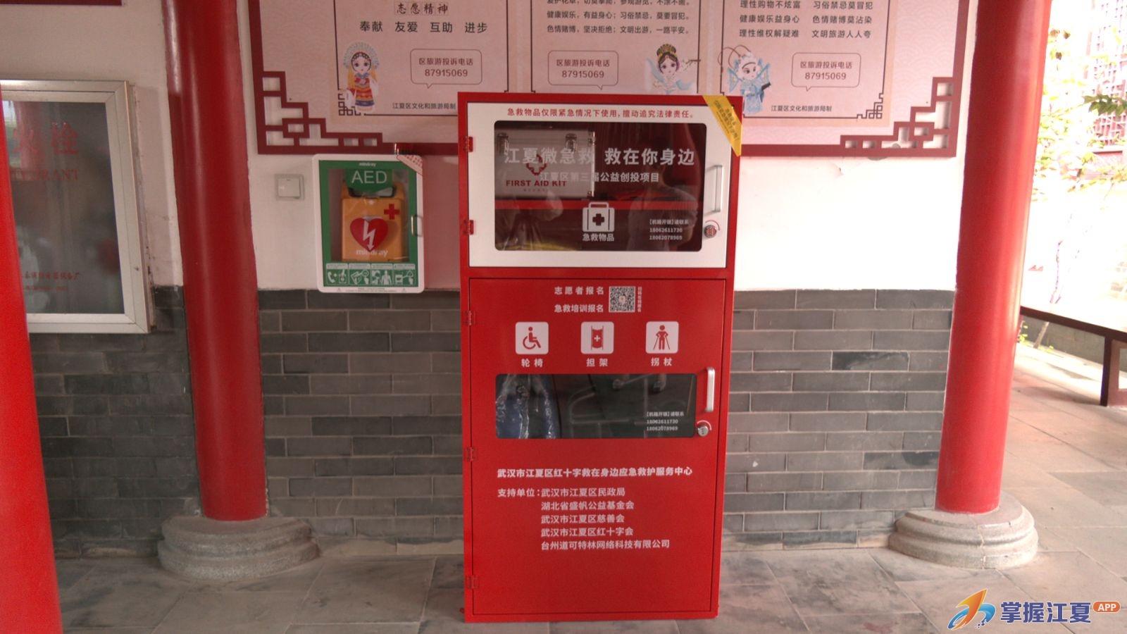 每个博爱驿站配有医药箱、灭火毯、救生锤、轮椅、担架、拐杖等急救物品,群众可根据个人应急需求,自行使用。本项目三个博爱驿站的位置分别位于:谭鑫培公园、建材花园小区、八分山景区,是结合应急救护、便民服务于一体的公共服务设施。通过让急救进公共场所、进社区、进景区,全方位保障了市民的出行安全。除了配备有急救设备,江夏区红十字救在身边应急救护服务中心还定期向群众普及救护知识与理念,通过实际行动,发动群众、共建、共管、共享。目前已开展了8场培训,参加红十字普及培训152人,参加初级救护员培训并发证187人。