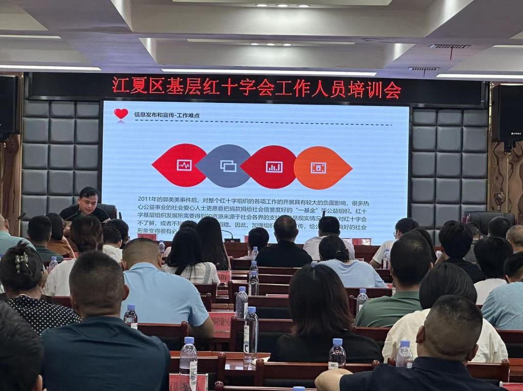 为了加强江夏区红十字会基层组织建设,进一步提高基层红十字工作的水平,提升基层组织服务群众能力,促进全区红十字事业的协调发展,8月31日,江夏区红十字会举办全区红十字工作人员培训班。全区各街道(办事处)、开发区、相关区直部门、医疗机构红十字会副会长、秘书长,区红会直属社会组织及及红十字救援队、博爱家园及红十字服务站负责人共70余人参加培训。