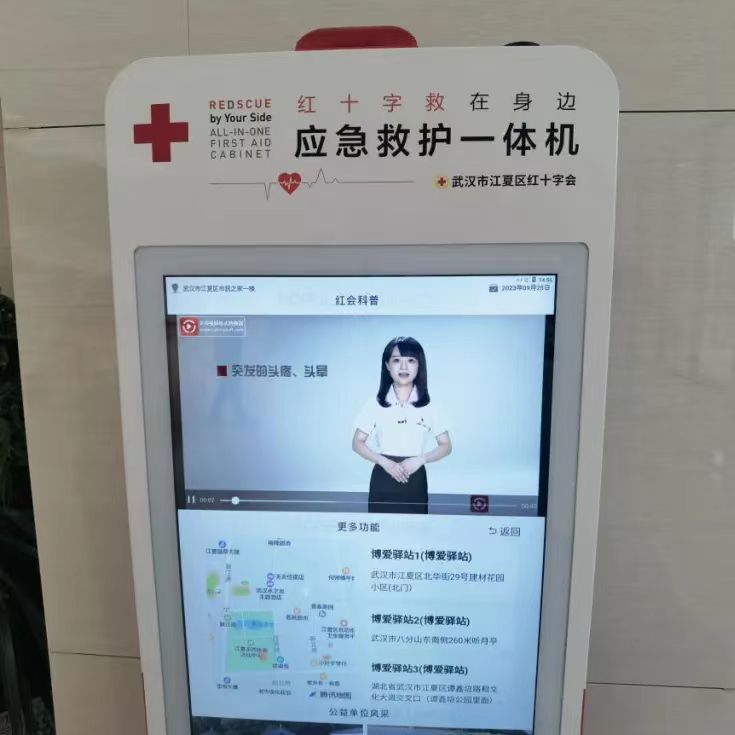 应急救护一体机是集合AED、急救包、交互大屏于一体的应急救护设备,主要用于辅助实施院前急救,对紧抓应急救援的生命“黄金4分钟”起着至关重要的作用。设备通过环境营造、物联技术应用可以为公众提供便捷的应急救护设备查找、导航,急救知识学习等服务,同时为设备管理人员提供AED巡检、耗材预警、使用监控、日志管理等远程便捷管理功能。大屏中的红会科普版块还通过滚动播放急救知识视频,引导更多公众学习急救、学会急救、敢于施救,帮助提升社会公众健康意识和自救互救能力。