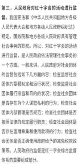 总则第五条:各级人民政府对红十字会给予支持和资助,保障红十字会依法履行职责,并对其活动进行监督。