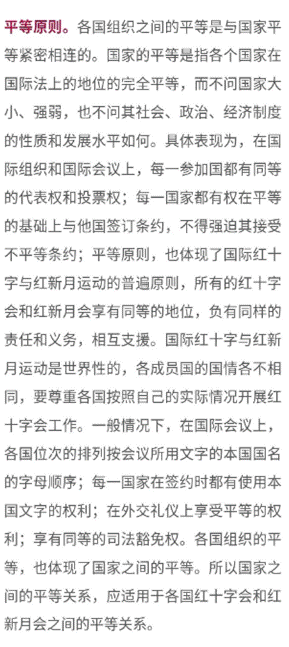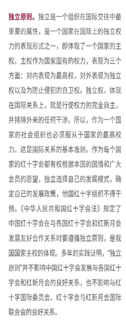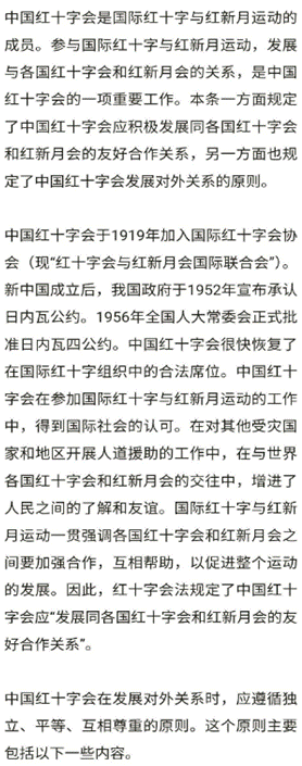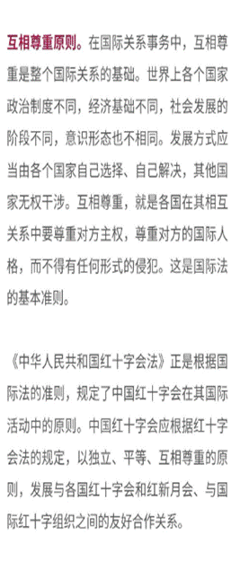 总则第六条:中国红十字会根据独立、平等、互相尊重的原则,发展同各国红十字会和红新月会的友好合作关系。